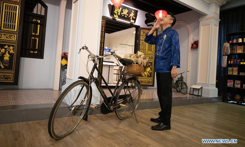 A man poses for photos at the Peranakan Phuket Museum in Phuket, Thailand, Sept. 12, 2020. The museum displays the Peranakan history and culture through various exhibits and technologies. (Xinhua/Zhang Keren)