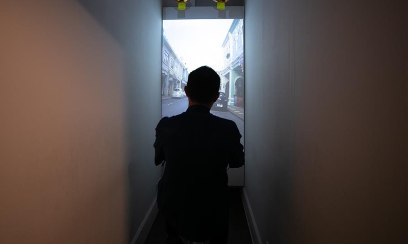 A man takes a virtual bicycle tour of Phuket Old Town at the Peranakan Phuket Museum in Phuket, Thailand, Sept. 12, 2020. The museum displays the Peranakan history and culture through various exhibits and technologies. (Xinhua/Zhang Keren)