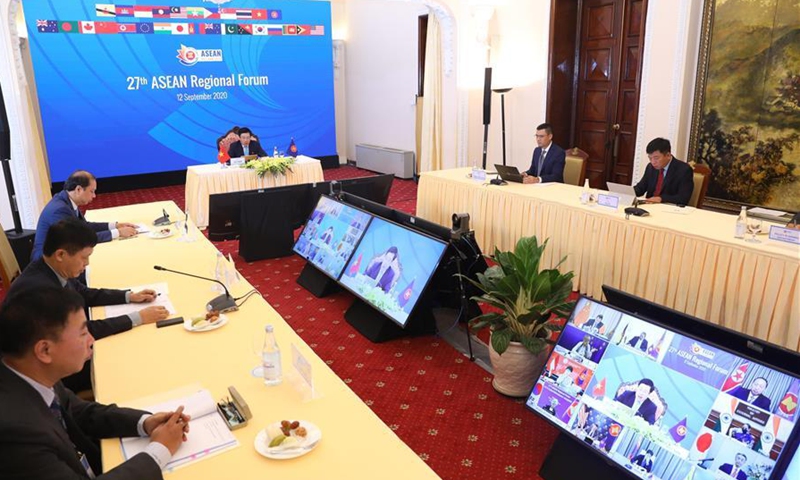 Vietnamese delegates attend the 27th meeting of the Association of Southeast Asian Nations (ASEAN) Regional Forum (ARF) in Hanoi, Vietnam, on Sept. 12, 2020. The 27th meeting of the Association of Southeast Asian Nations (ASEAN) Regional Forum (ARF) agreed Saturday to promote cooperation in order to respond to and mitigate the impacts of the COVID-19 epidemic and other contagious diseases. (VNA via Xinhua)