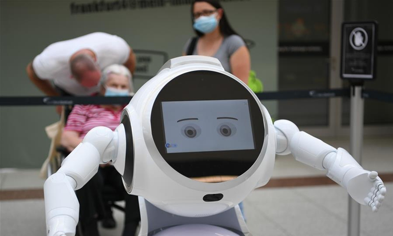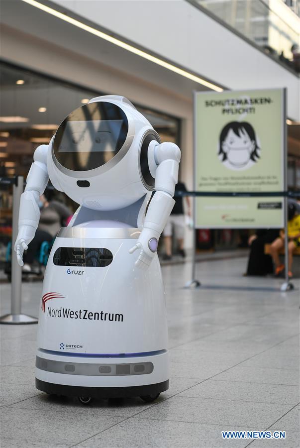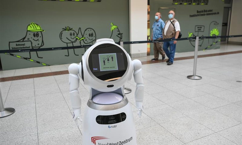 Photo taken on Sept. 12, 2020 shows a smart robot explaining COVID-19 prevention measures at a shopping mall in Frankfurt, Germany. (Xinhua/Lu Yang)