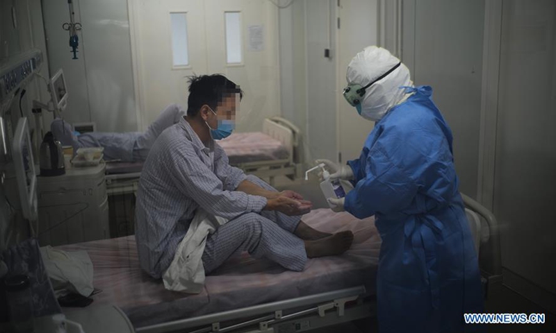 A nurse disinfects the hands of a COVID-19 patient at an isolation ward in Beijing Ditan Hospital in Beijing, capital of China, June 16, 2020.