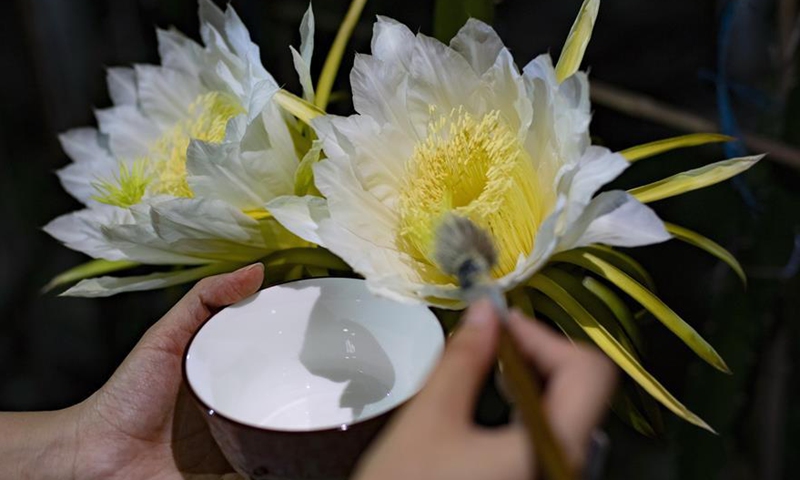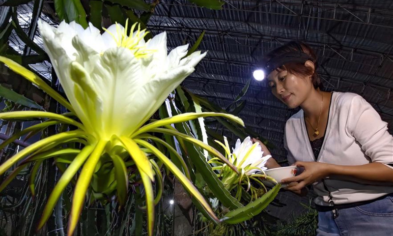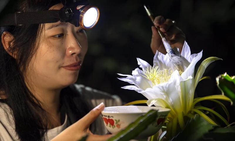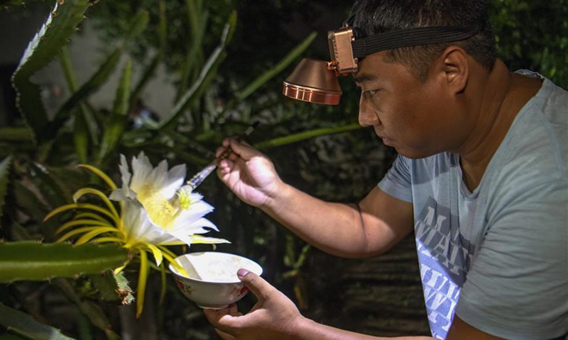 A farmer pollinates dragon fruit at a dragon fruit planting base in Luanzhou, north China's Hebei Province, Sept. 12, 2020. (Xinhua/Yang Shiyao)