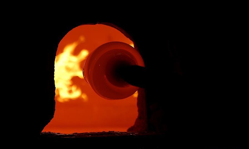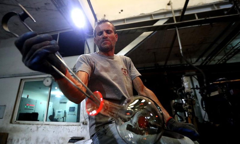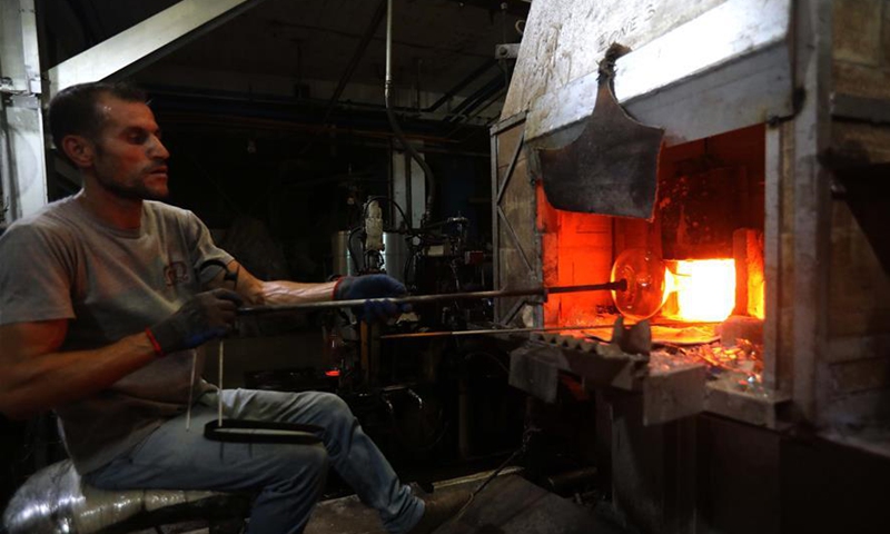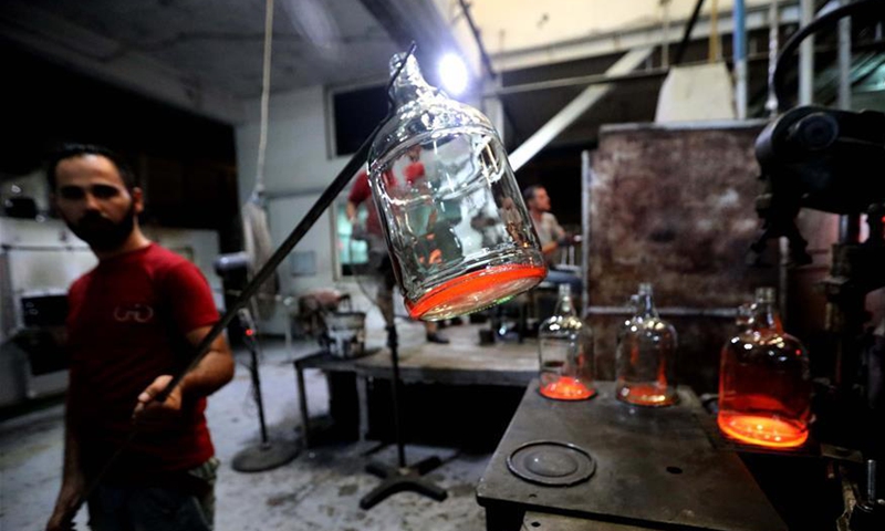 A worker makes glassware at a glass factory in Tripoli, Lebanon, Sept. 12, 2020. Two huge explosions rocked Port of Beirut on Aug. 4, shaking buildings all over Lebanon's capital, killing around 190 people and injuring about 6,500 others. The glass on buildings destroyed in the explosions have been recycled by local people to make glassware. (Xinhua/Bilal Jawich)