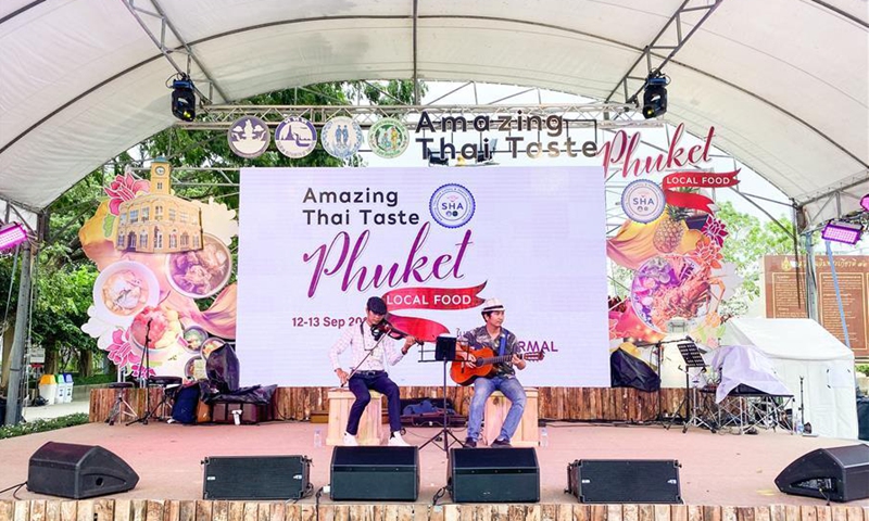 Musicians perform at a food festival in the old town of Phuket, Thailand, Sept. 13, 2020. The two-day festival was held to boost tourism and local economy. (Xinhua/Zhang Keren)