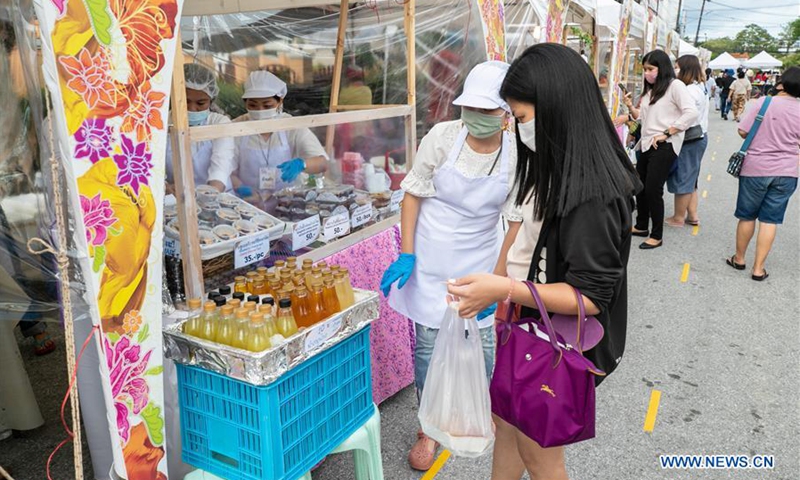 Vendors recommends drinks to a customer at a food festival in the old town of Phuket, Thailand, Sept. 13, 2020. The two-day festival was held to boost tourism and local economy. (Xinhua/Zhang Keren)