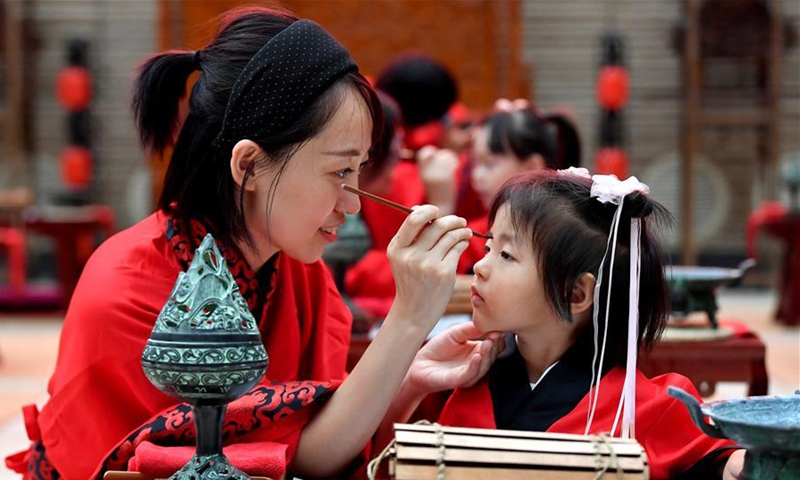 A girl gets a red dot on her forehead, which is called "opening the wisdom eye", during the First Writing Ceremony, a traditional activity held for children before they are admitted to school, at a museum in Xi'an, northwest China's Shaanxi Province, Sept. 13, 2020. (Xinhua/Liu Xiao)