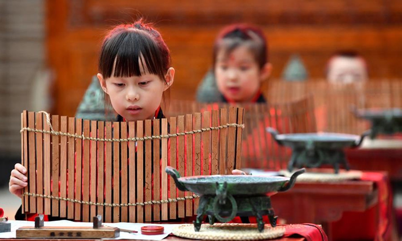 Children attend the First Writing Ceremony, a traditional activity held for children before they are admitted to school, at a museum in Xi'an, northwest China's Shaanxi Province, Sept. 13, 2020. (Xinhua/Liu Xiao)