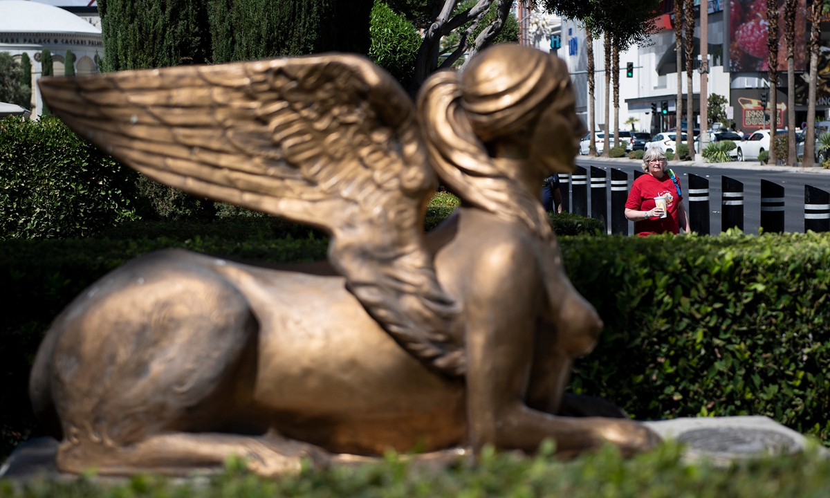 A woman walks along the Strip as the city continues to adapt to the COVID-19 pandemic on Sunday in Las Vegas. Photo: AFP