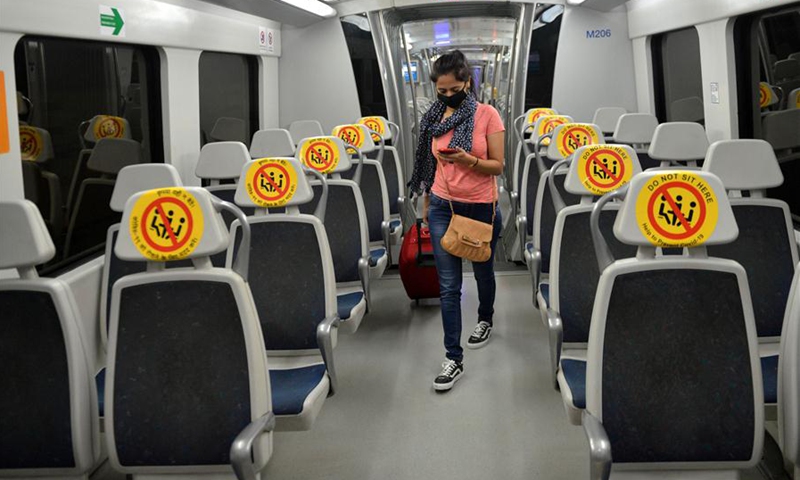 A passenger wearing a face mask is seen on a metro train in New Delhi, India, on Sept. 12, 2020. Metro rail services in New Delhi Saturday morning resumed fully after remaining shut for over five months due to the ongoing COVID-19 pandemic, officials said. Photo: Xinhua