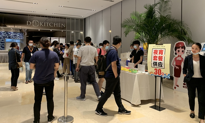 Working till late night, Huawei staff enjoy late night snacks offered by the company for free around 10pm at the company's headquarters in Dongguan, South China's Guangdong Province. Photo: Chen Qingqing/GT