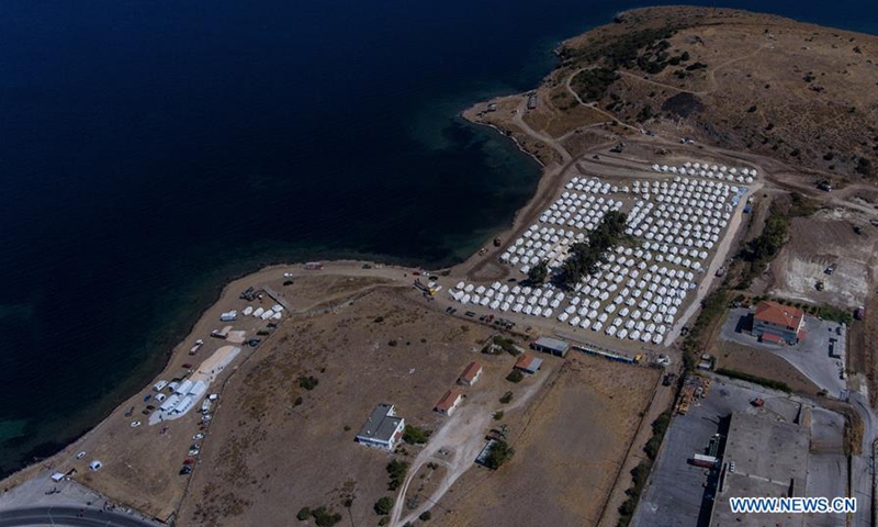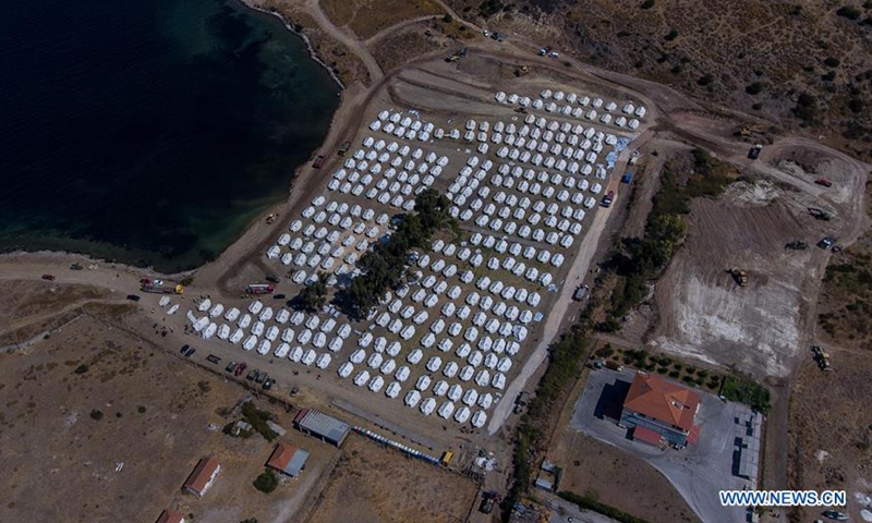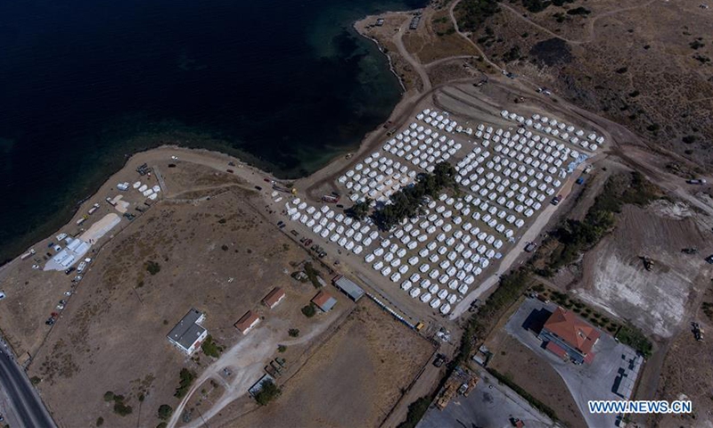 Aerial photo taken on Sept. 14, 2020 shows new tents for relocating migrants and refugees at Kara Tepe, Lesvos, Greece, after a fire broke out last Wednesday and destroyed the previous camp in Moria. (Photo by Panagiotis Balaskas/Xinhua)