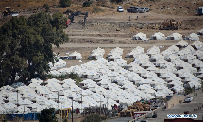 Photo taken on Sept. 14, 2020 shows new tents for relocating migrants and refugees at Kara Tepe, Lesvos, Greece, after a fire broke out last Wednesday and destroyed the previous camp in Moria. (Photo by Panagiotis Balaskas/Xinhua)