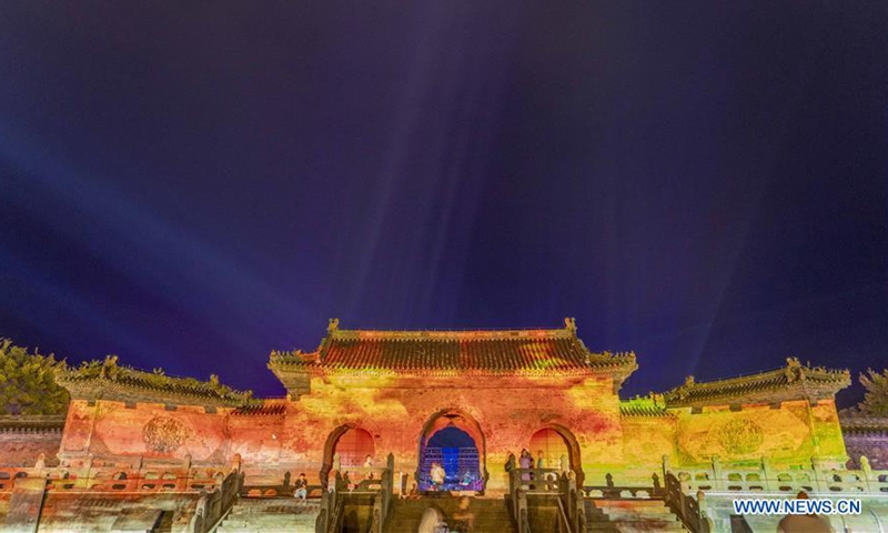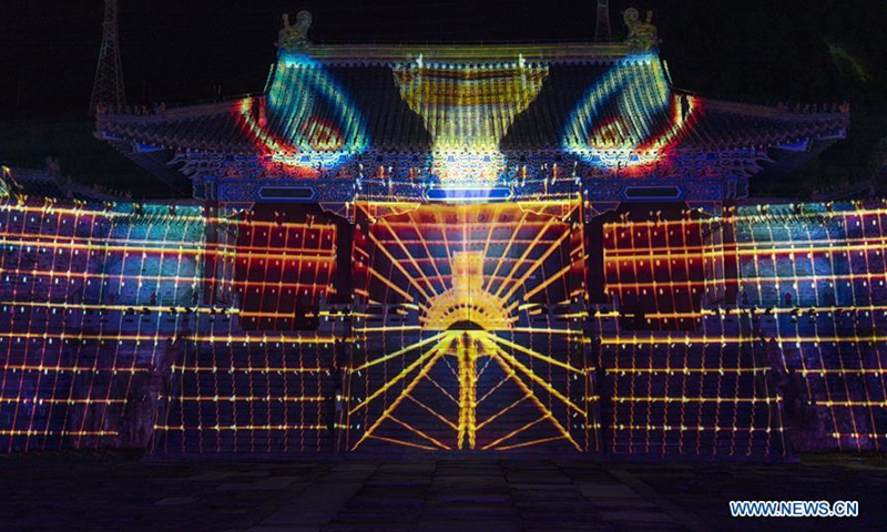 Photo taken on Sept. 14, 2020 shows the view of a light show at the Yuxu Palace scenic area on Wudang Mountain in central China's Hubei Province. (Xinhua/Du Huaju)