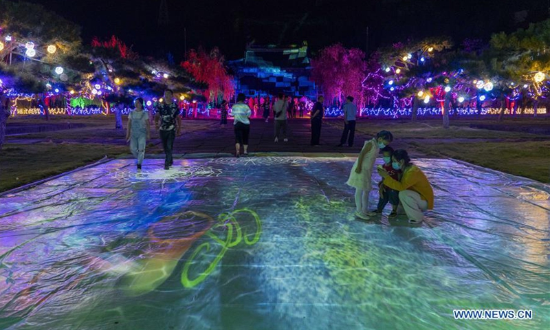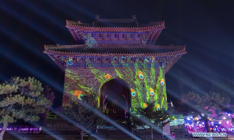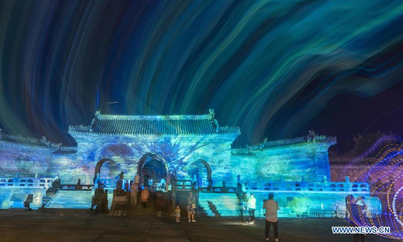 Tourists admire a light show at the Yuxu Palace scenic area on Wudang Mountain in central China's Hubei Province, Sept. 14, 2020. (Xinhua/Du Huaju)