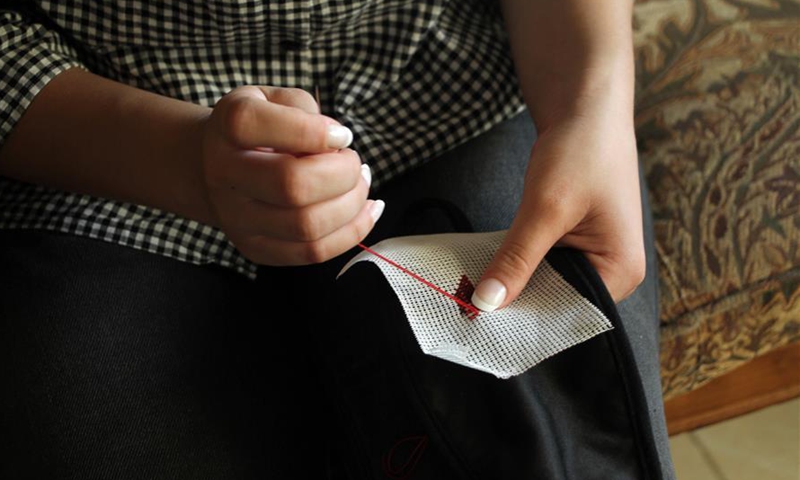 A Palestinian girl makes embroidery on a face mask at her house in Gaza City, on Sept. 14, 2020. (Photo by Rizek Abdeljawad/Xinhua)