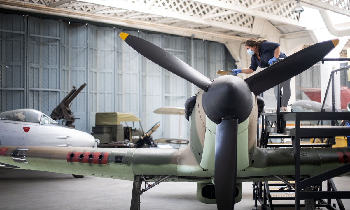 Samantha Archetti, Collections Care Technician, cleans a Hurricane ahead of the reopening of its Battle of Britain exhibition at IWM Duxford, which marks 80 years since the German Luftwaffe began its air attacks at the start of the Battle of Britain. Photo: VCG