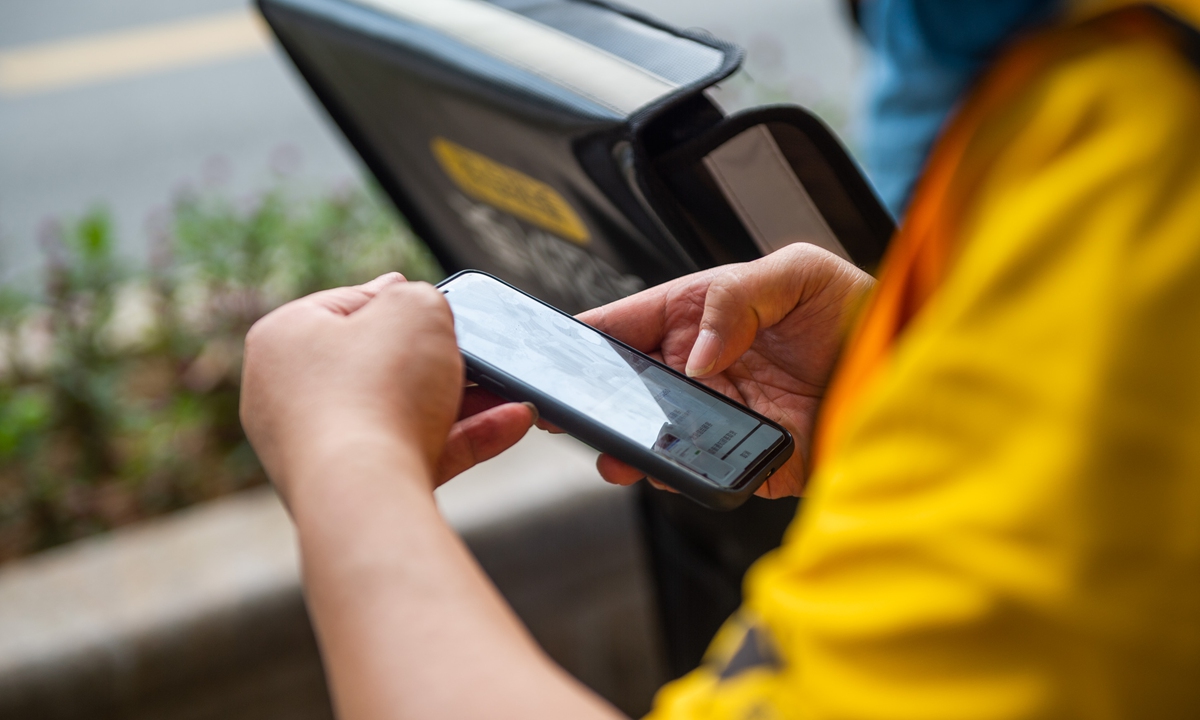 A deliveryman of a Chinese online takeaway service checks orders on the phone. Photo: IC