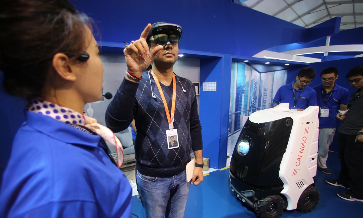 A visitor interacts with a robot arm at the first experience area featuring a 5G wireless network in Hangzhou, East China's Zhejiang Province on May 17, 2019. Photo: cnsphoto