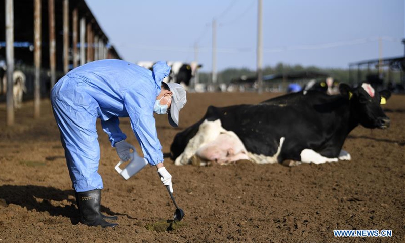 A technician take samples of cow dung to monitor their health conditions at the Musha Ranch in Zhongwei, northwest China's Ningxia Hui Autonomous Region, Sept. 14, 2020. (Xinhua/Wang Peng)