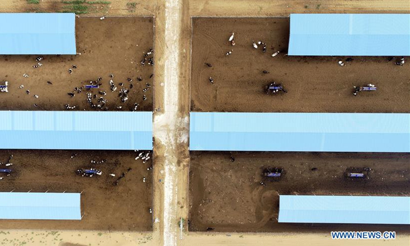 Aerial photo taken on Sept. 8, 2020 shows the cow breeding base at the Musha Ranch in Zhongwei, northwest China's Ningxia Hui Autonomous Region. (Xinhua/Wang Peng)