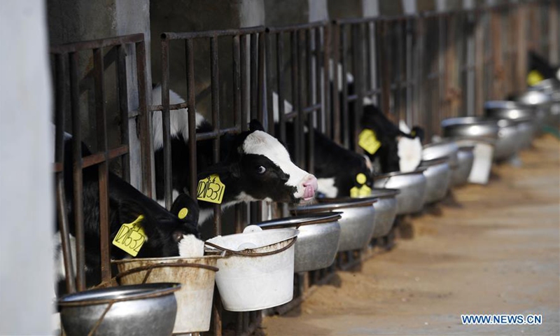 Calves eat food at the calf breeding area of the Musha Ranch in Zhongwei, northwest China's Ningxia Hui Autonomous Region, Sept. 14, 2020. (Xinhua/Wang Peng)