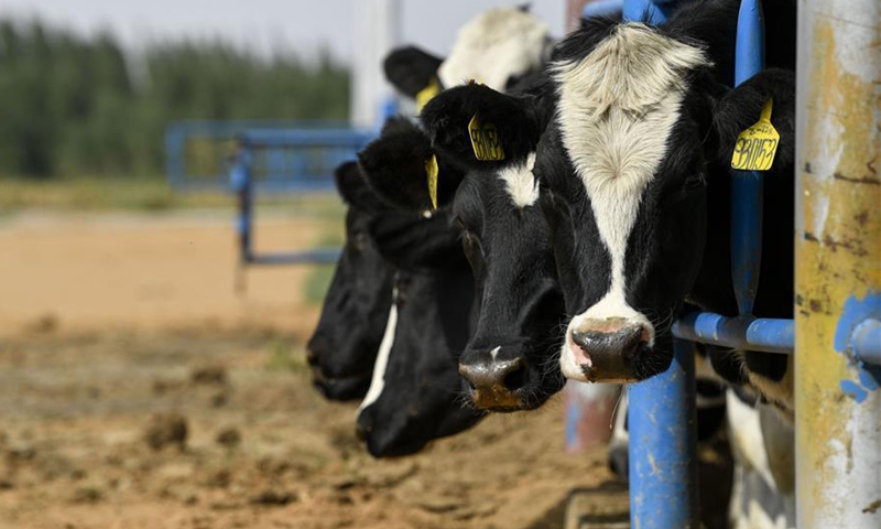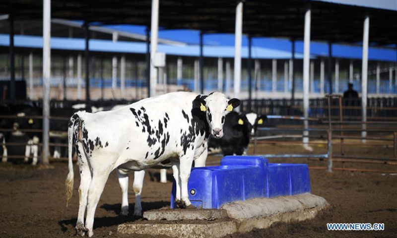 Cows drink water at a breeding base of the Musha Ranch in Zhongwei, northwest China's Ningxia Hui Autonomous Region, Sept. 14, 2020. (Xinhua/Wang Peng)