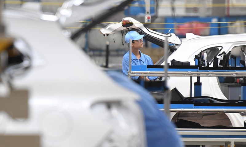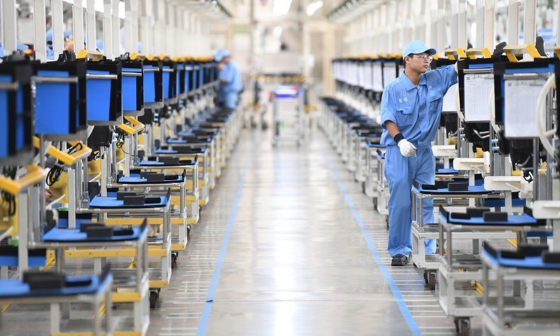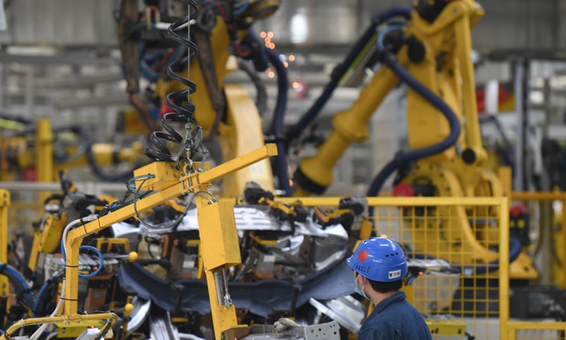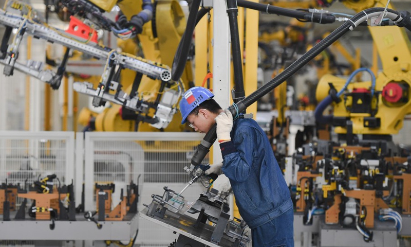 A worker works on the assembly line at a passenger car workshop of Ningde base of SAIC Motor Corporation Ltd. in Ningde, southeast China's Fujian Province, Sept. 15, 2020. (Xinhua/Song Weiwei)