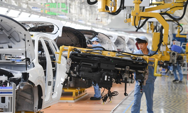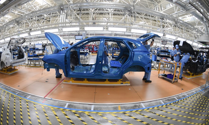 People work on the assembly line at a passenger car workshop of Ningde base of SAIC Motor Corporation Ltd. in Ningde, southeast China's Fujian Province, Sept. 15, 2020. (Xinhua/Song Weiwei)
