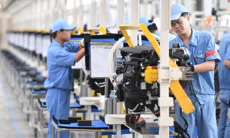 Workers assemble control system of instrument panel at a passenger car workshop of Ningde base of SAIC Motor Corporation Ltd. in Ningde, southeast China's Fujian Province, Sept. 15, 2020. (Xinhua/Song Weiwei)