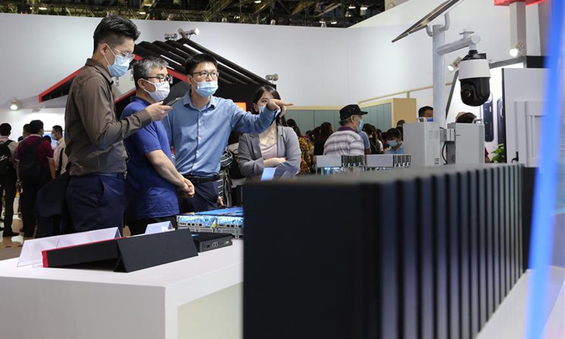 People visit the booth of Huawei at the comprehensive exhibition area of the 2020 China International Fair for Trade in Services (CIFTIS) in Beijing, capital of China, Sept. 8, 2020. Chinese enterprises demonstrated latest innovations and technologies such as 5G and AI at the fair. (Xinhua/Pan Siwei)