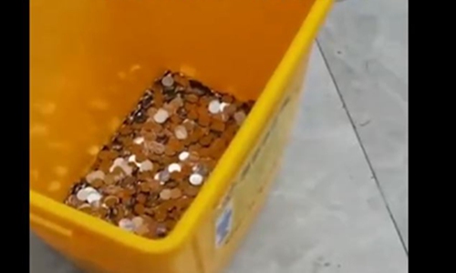 A woman from Zizhong county in Southwest China's Sichuan Province who won a labor dispute against her employer receives two buckets of thousands of coins as for her work compensation. Photo: Screenshot of a video posted by Hongxing News