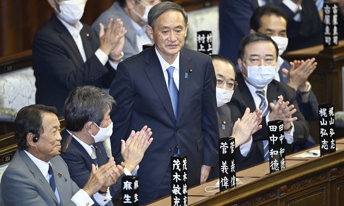Newly elected Liberal Democratic Party leader Yoshihide Suga (center) bows after he was elected as Japan's 99th prime minister, in Tokyo on Wednesday. Suga pledged continuity with Shinzo Abe, and 15 out of the 20 appointees in his cabinet had ministerial portfolios in the previous administration. Photo: VCG
