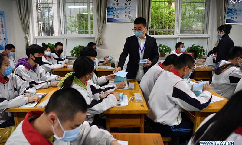 Teachers hands out face masks to students in Huizhi Middle School in Xi'an, northwest China's Shaanxi Province, April 7, 2020. Students in the final year of junior high schools or vocational schools returned to school on April 7 in Shaanxi. (Xinhua/Liu Xiao)