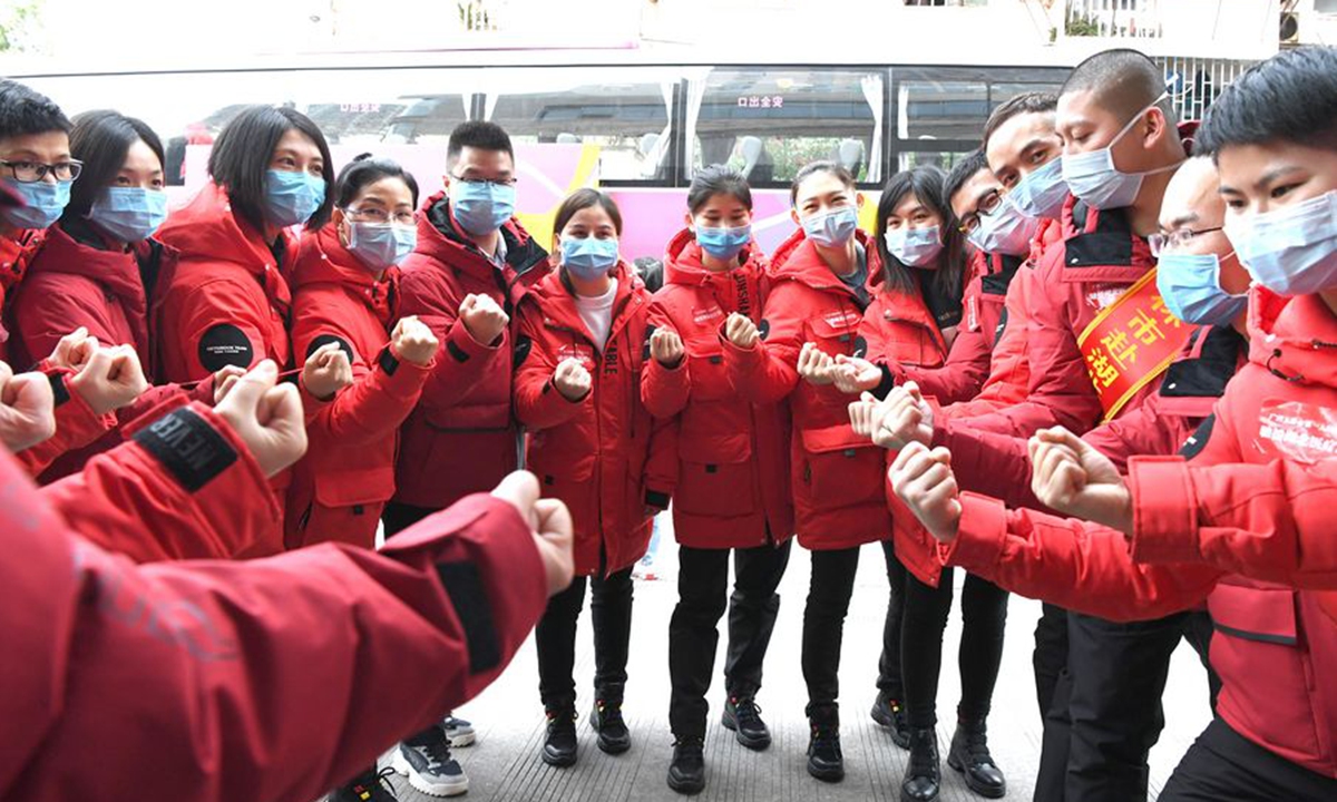 Medical team members encourage each other before leaving for Wuhan in Nanning, south China's Guangxi Zhuang Autonomous Region, Feb. 21, 2020. (Xinhua/Zhou Hua)