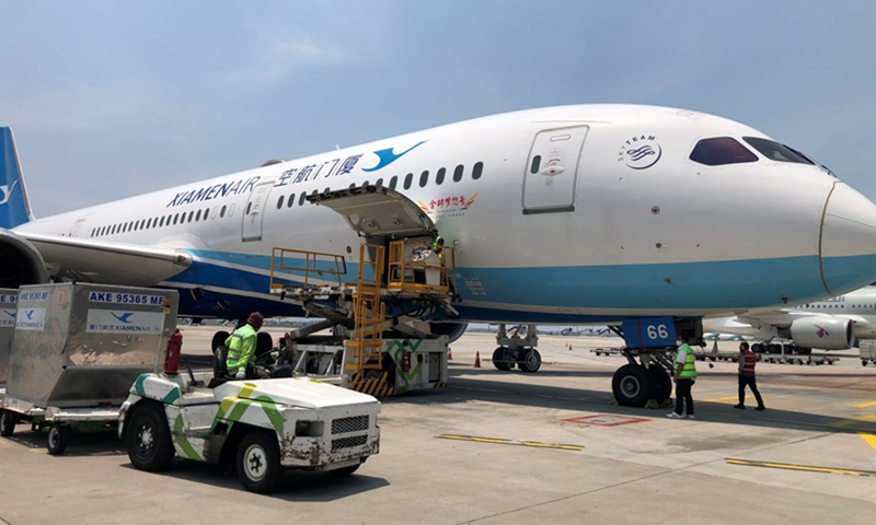 A Xiamen Airlines Boeing 787 passenger plane arrives in Jakarta, capital of Indonesia on Thursday. Photo: courtesy of the Jakarta office of Xiamen Airlines