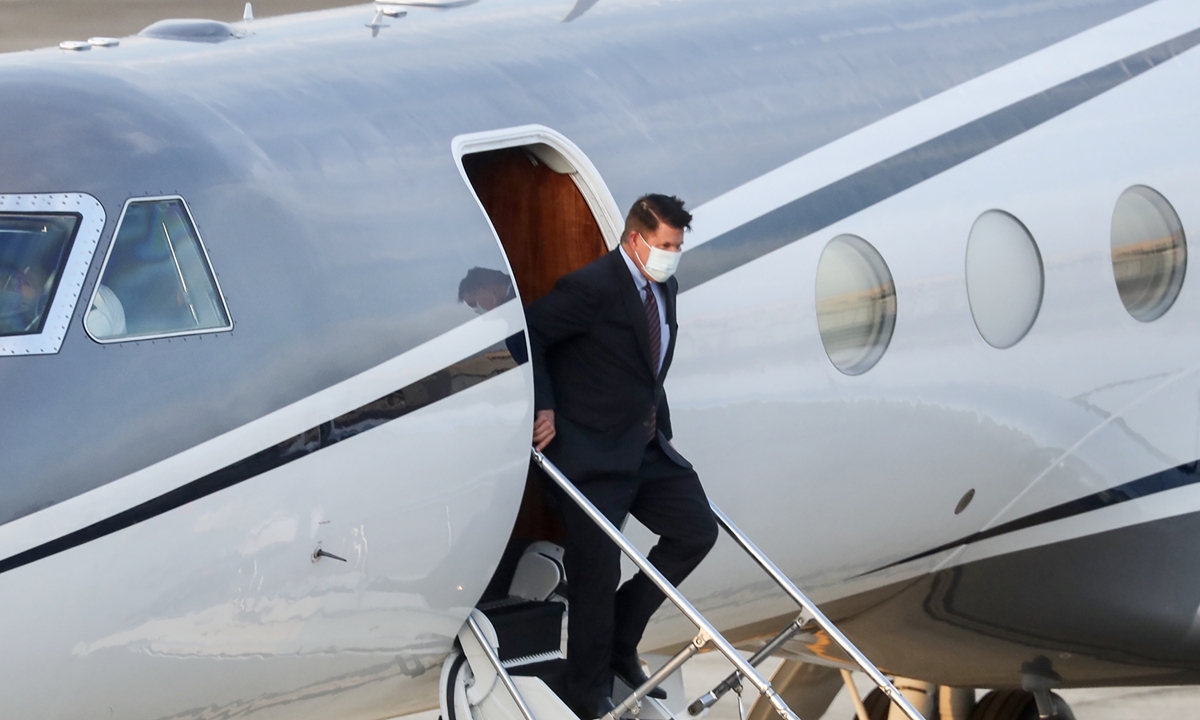 US Undersecretary of State Keith Krach alights from an aircraft after landing at the Sungshan airport in Taipei on Thursday. Photo: AFP