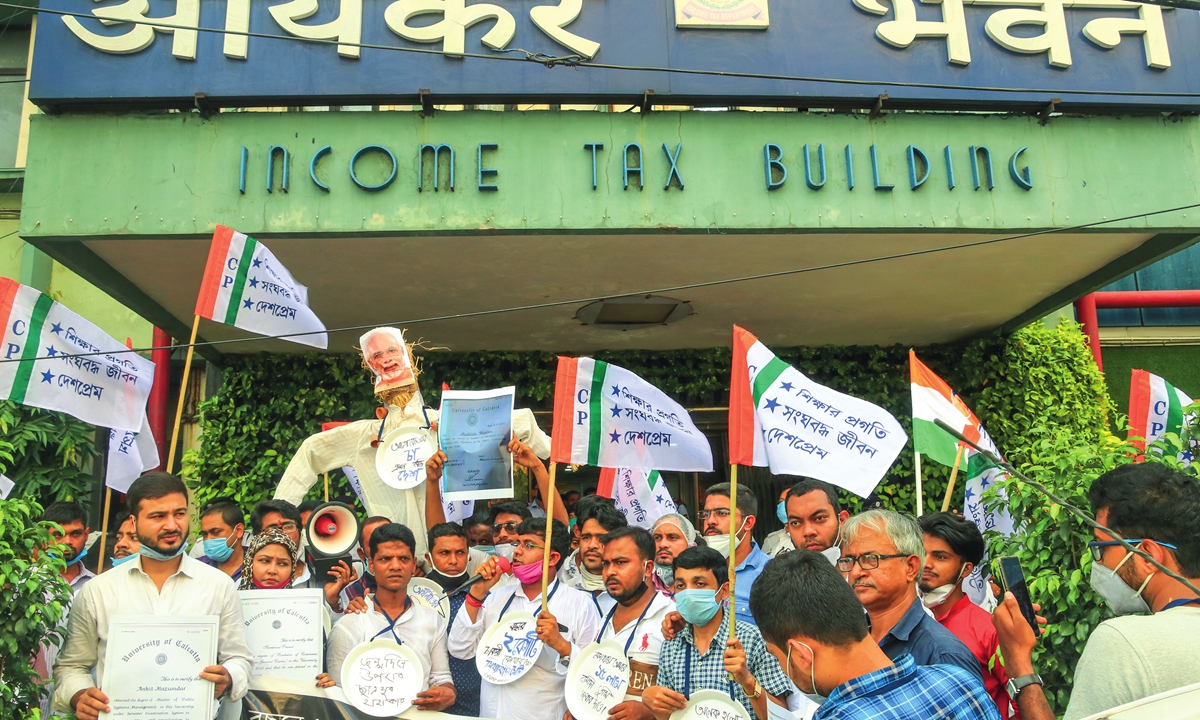 Youth Congress activists protest on the 70th birthday of Prime Minister Narendra Modi on National Unemployment Day at the front of the Income Tax Building in Kolkata, India on Thursday. These activists carried out a nationwide campaign by taking out protest marches and unfurling huge banners demanding jobs. Photo: AFP