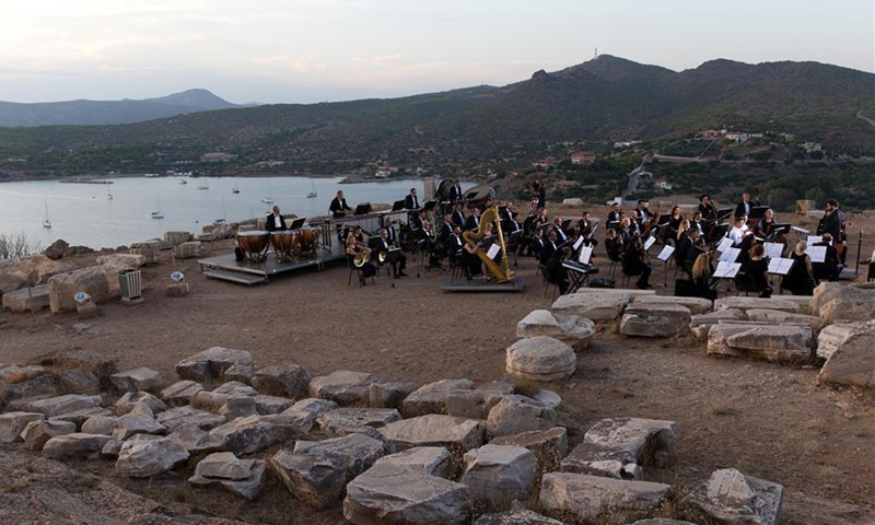 Musicians perform a musical in front of the ruins of the Temple of Poseidon at cape Sounion, some 70 km southeast of Athens, Greece, on Sept. 17, 2020. On the occasion of the 70th anniversary of the establishment of the Greek National Tourism Organization (GNTO) and the 71st anniversary of the founding of the People's Republic of China and the Mid-Autumn festival, a musical entitled "As long as there shall be Achaeans -- Variations on a Sunbeam" was staged on Thursday in front of the ruins of the emblematic 2,500-year-old Temple of Poseidon, the god of the sea in Greek mythology. (Xinhua/Marios Lolos)