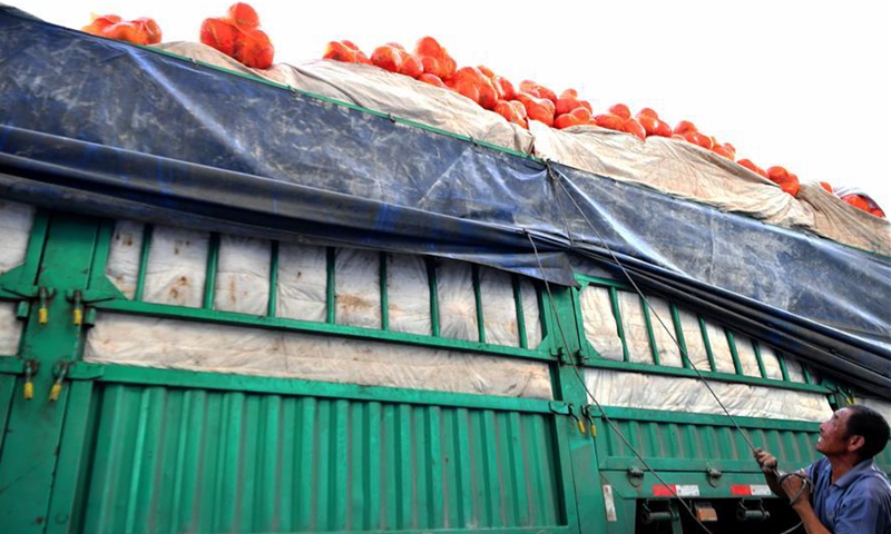 A worker loads a truck with pomelos outside a processing factory in Pinghe County, southeast China's Fujian Province, Sept. 17, 2020. Lying in the southwest of Fujian Province, Pinghe is famous for the cultivation of pomelos with a planting area of around 700,000 mu (about 46,667 hectares). Today, the output value of industries related to pomelo has surpassed ten billion yuan (about 1.48 billion U.S. dollars) as the annual yield of pomelos here has reached 1.3 million tonnes. Increasing per capita disposable income from 2,141 yuan (about 316 U.S. dollars) in 1996 to 19,360 yuan (about 2,860 U.S. dollars) in 2019, the cultivation of pomelos has paved the way for poverty alleviation and better life for the farmers who engage in the industries. (Xinhua/Wei Peiquan)