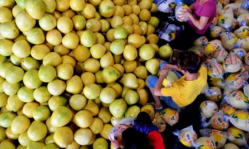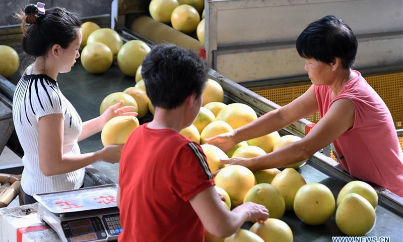 Employees package pomelos at a processing factory in Pinghe County, southeast China's Fujian Province, Sept. 17, 2020. Lying in the southwest of Fujian Province, Pinghe is famous for the cultivation of pomelos with a planting area of around 700,000 mu (about 46,667 hectares). Today, the output value of industries related to pomelo has surpassed ten billion yuan (about 1.48 billion U.S. dollars) as the annual yield of pomelos here has reached 1.3 million tonnes. Increasing per capita disposable income from 2,141 yuan (about 316 U.S. dollars) in 1996 to 19,360 yuan (about 2,860 U.S. dollars) in 2019, the cultivation of pomelos has paved the way for poverty alleviation and better life for the farmers who engage in the industries. (Xinhua/Wei Peiquan)