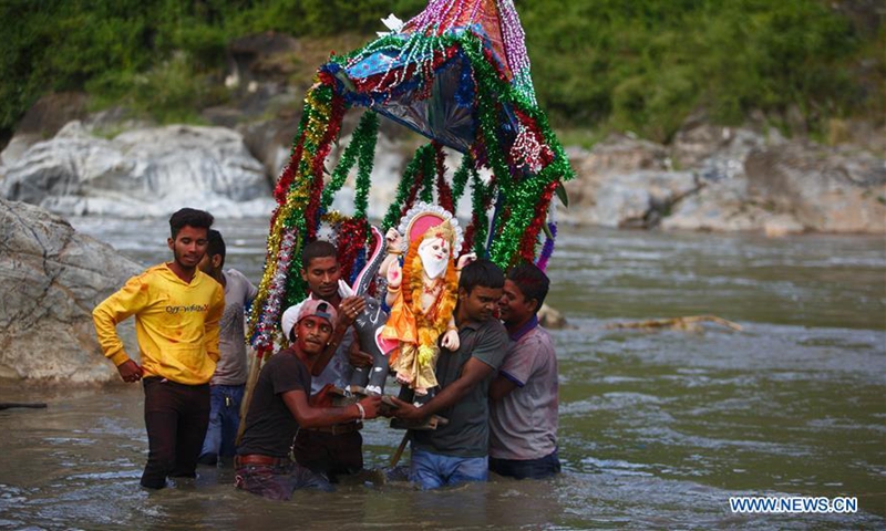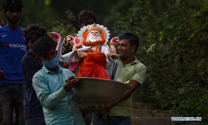 Devotees carry the idol of Lord Vishwakarma, god of craftsman and architect, to immerse in Bagmati river to conclude the Vishwakarma Festival in Kathmandu, Nepal, Sept. 18, 2020. (Photo by Sulav Shrestha/Xinhua)