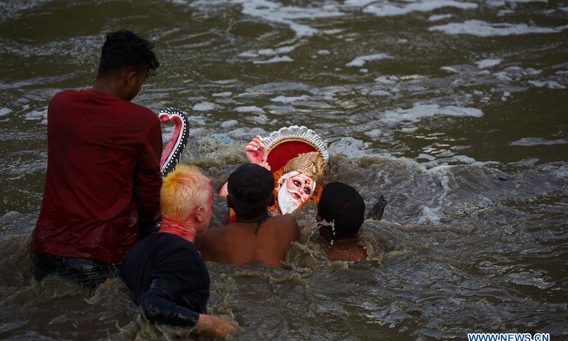 Devotees immerse the idol of Lord Vishwakarma, god of craftsman and architect, in Bagmati river to conclude the Vishwakarma Festival in Kathmandu, Nepal, Sept. 18, 2020. (Photo by Sulav Shrestha/Xinhua)