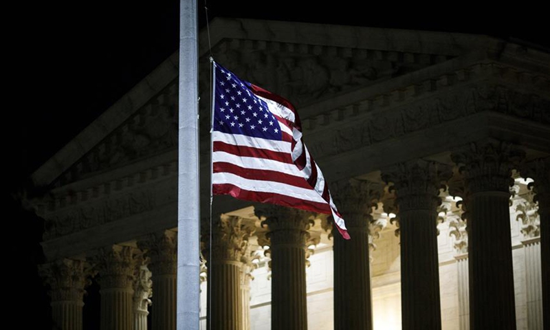 The U.S. national flag flies at half-mast outside the U.S. Supreme Court following the death of U.S. Supreme Court Justice Ruth Bader Ginsburg in Washington, D.C., the United States, Sept. 18, 2020. U.S. Supreme Court Justice Ruth Bader Ginsburg has died, the Supreme Court said Friday. The second female justice on the U.S. highest court, Ginsburg, 87, was a legal pioneer advocating for gender equality. (Photo by Ting Shen/Xinhua)