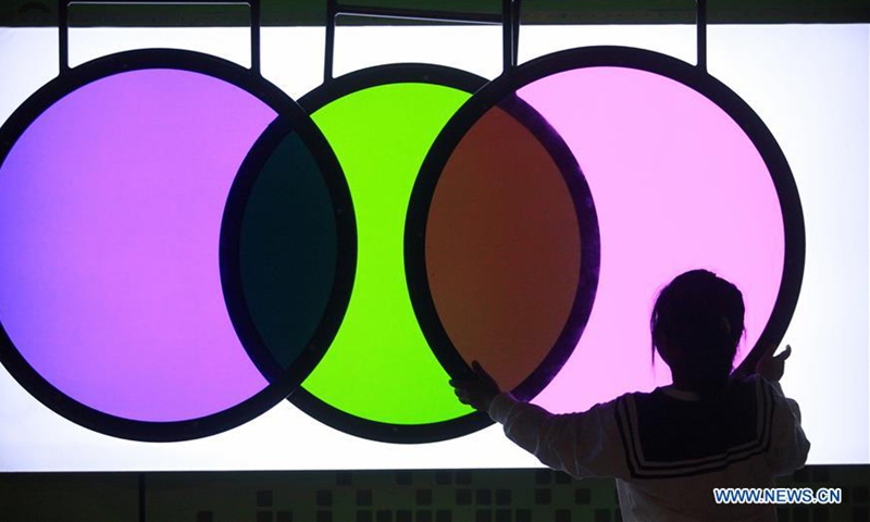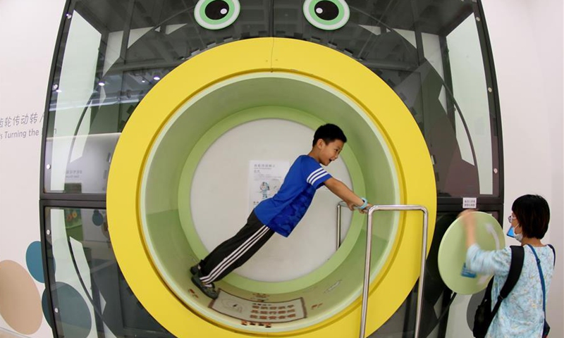 A child experiences a rolling gear at Hisense Sci-exploration Center in Qingdao, east China's Shandong Province, Sept. 19, 2020. The 16th National Science Popularization Day kicked off on Saturday. Activities to popularize science started Saturday across the country and will last until Sept. 25. (Photo by Tang Ke/Xinhua)