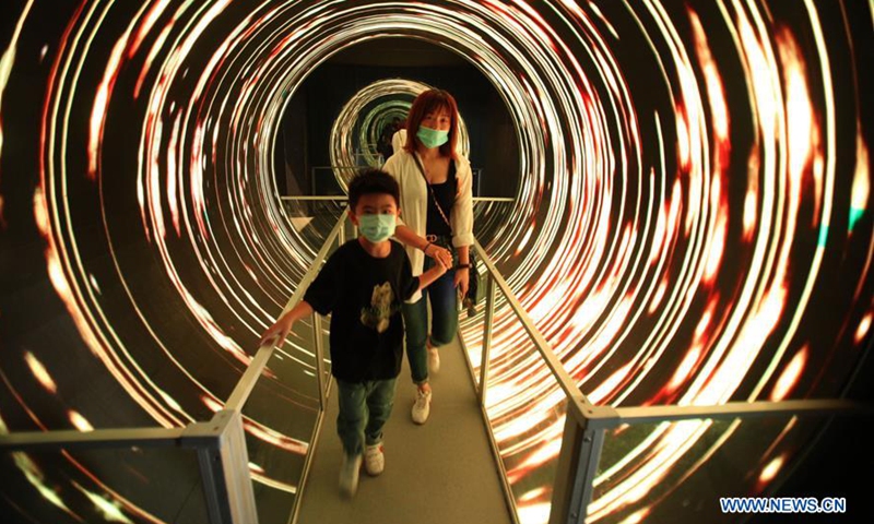 A child and his mother walk through a dazzling channel at Nanjing Science and Technology Museum in Nanjing, east China's Jiangsu Province, Sept. 19, 2020. The 16th National Science Popularization Day kicked off on Saturday. Activities to popularize science started Saturday across the country and will last until Sept. 25. (Photo by Sun Zhongnan/Xinhua)