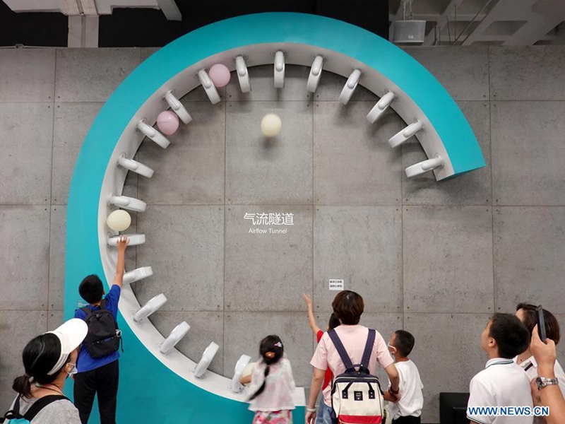 Children experience airflow tunnel at Hisense Sci-exploration Center in Qingdao, east China's Shandong Province, Sept. 19, 2020. The 16th National Science Popularization Day kicked off on Saturday. Activities to popularize science started Saturday across the country and will last until Sept. 25. (Photo by Tang Ke/Xinhua)