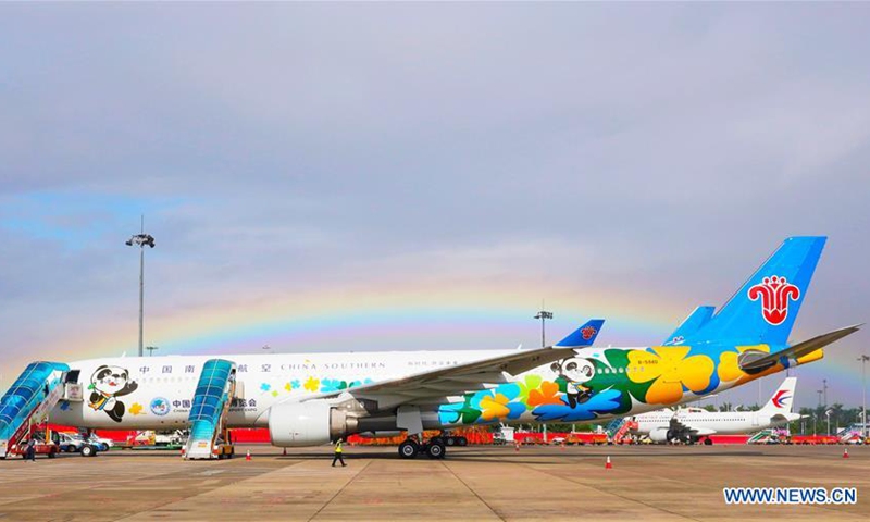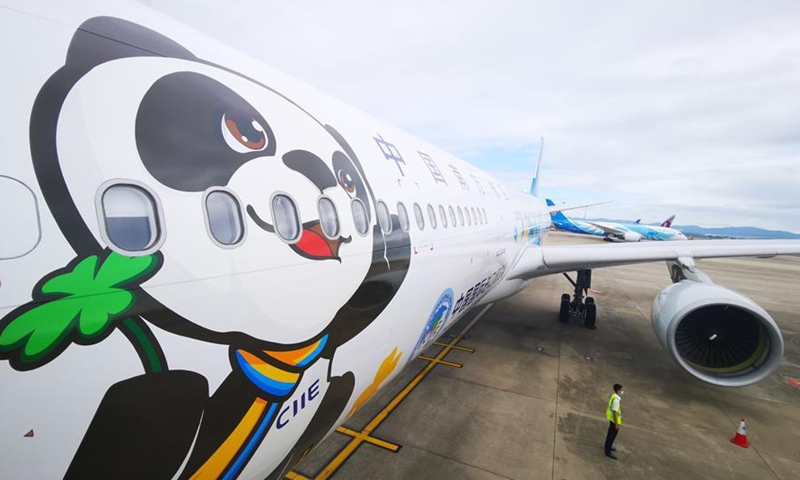 Photo taken on Sept. 19, 2020 shows a flight featuring the mascot of China International Import Expo (CIIE) at the Guangzhou Baiyun International Airport in Guangzhou, south China's Guangdong Province. The CIIE-themed airplane of China Southern Airlines made its debut here and made its maiden flight from Guangzhou to Shanghai on Saturday. (Xinhua/Tian Jianchuan)
