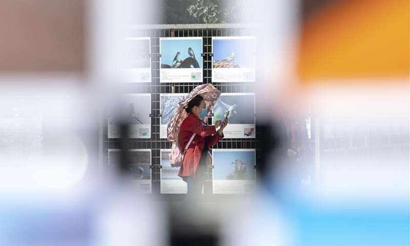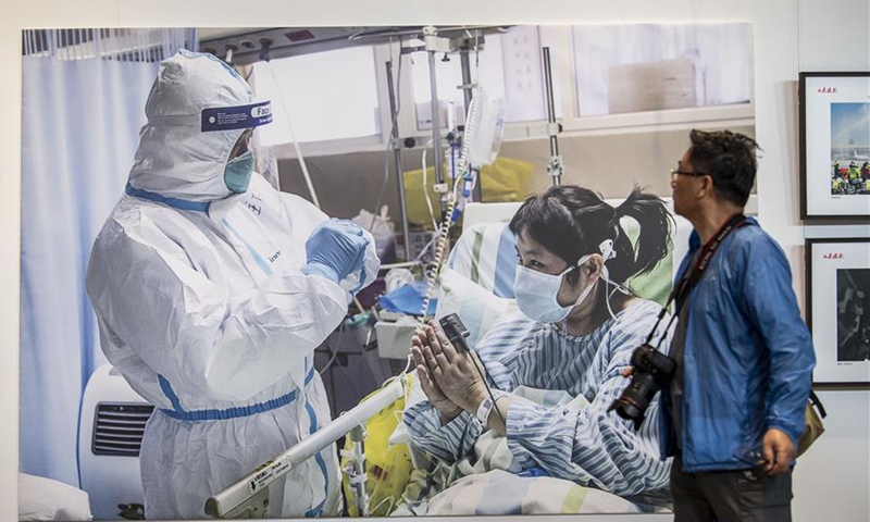 A man visits the Pingyao International Photography Festival at Pingyao County in Jinzhong, north China's Shanxi Province, Sept. 19, 2020. The festival kicked off on Saturday, displaying more than 10,000 photography works by over 2,400 photographers from 15 countries and regions. (Xinhua/Yang Chenguang)