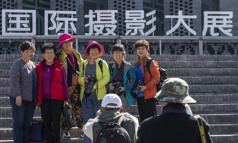 People pose for photos during their visit at the Pingyao International Photography Festival at Pingyao County in Jinzhong, north China's Shanxi Province, Sept. 19, 2020. The festival kicked off on Saturday, displaying more than 10,000 photography works by over 2,400 photographers from 15 countries and regions. (Xinhua/Yang Chenguang)
