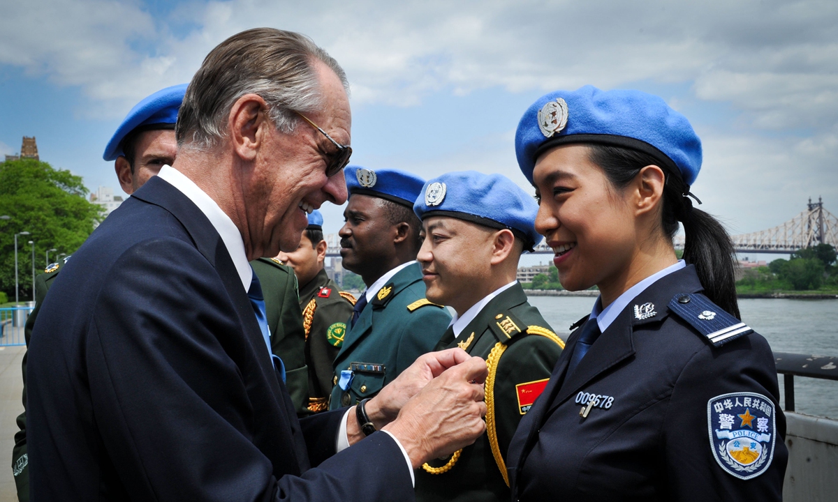 Jan Eliasson, former UN deputy secretary-general, decorates a Chinese peacekeeping police officer with a badge in May 2014. Photo: Xinhua